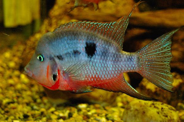 The Firemouth Cichlid is a beautiful cichlid that is somewhat territorial, especially during spawning. The common name, firemouth, is derived from the bright orange-red colouration on the underside of the jaw. Males in particular flare out their gills, exposing their red throats, in a threat display designed to ward off male rivals from their territory.Their background color is a pearlescent turquoise-blue with red edging the scales. The throat and breast are red in color, ranging from a brick shade to a fiery red. There is a series of black marks running along the body, starting behind the eye, extending to the base of the caudal fin. The membranes of the fins have turquoise spots and the dorsal fin is edged in red. The pelvic and anal fins are edged in black.