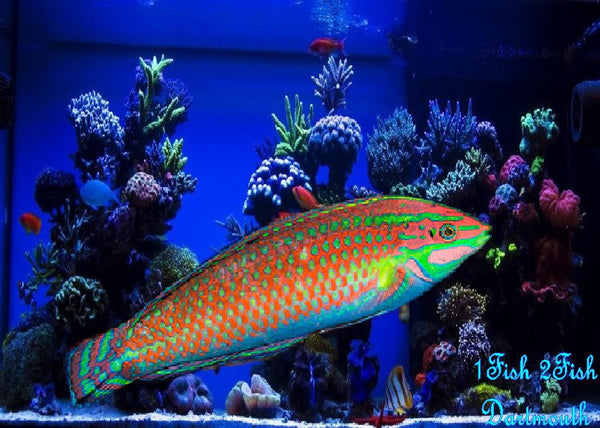 Halichoeres and Thalassoma wrasses are more active and aggressive than many other groups, especially as adults. Tankmates should be around the same size, aggression and activity level; avoid very small or docile tankmates, They should not be kept with invertebrates like crustaceans (crabs and shrimp) or feather duster worms. Some do not bother corals, but they may damage colonies as they search for food and may nip at polyps and fleshier corals. Feed a varied meaty diet of frozen and prepared foods; most wrasses will also graze on microinverts in the aquarium (copepods, amphipods, worms, etc.).