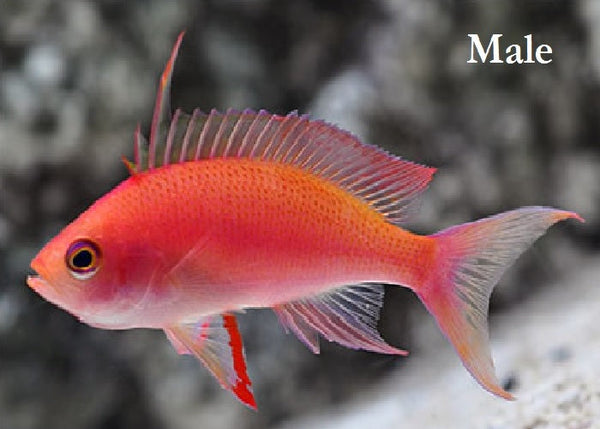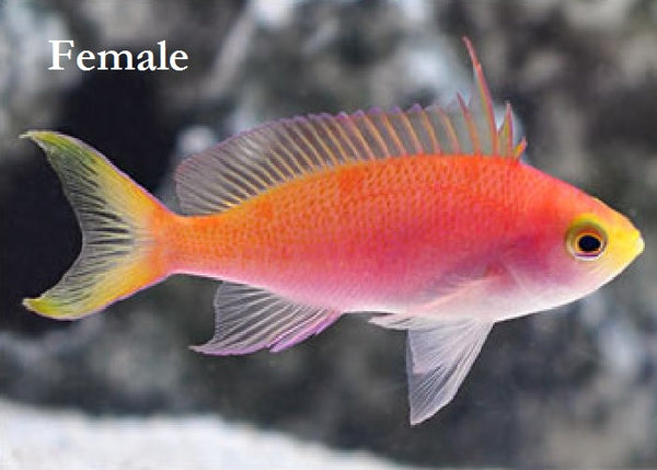 Male Randall's Anthias' become striped in red and magenta while females will have a yellow nose. Males are best kept alone with several females, or singly. This Anthias dwells toward the bottom of the tank and appreciates the availability of several hiding places.